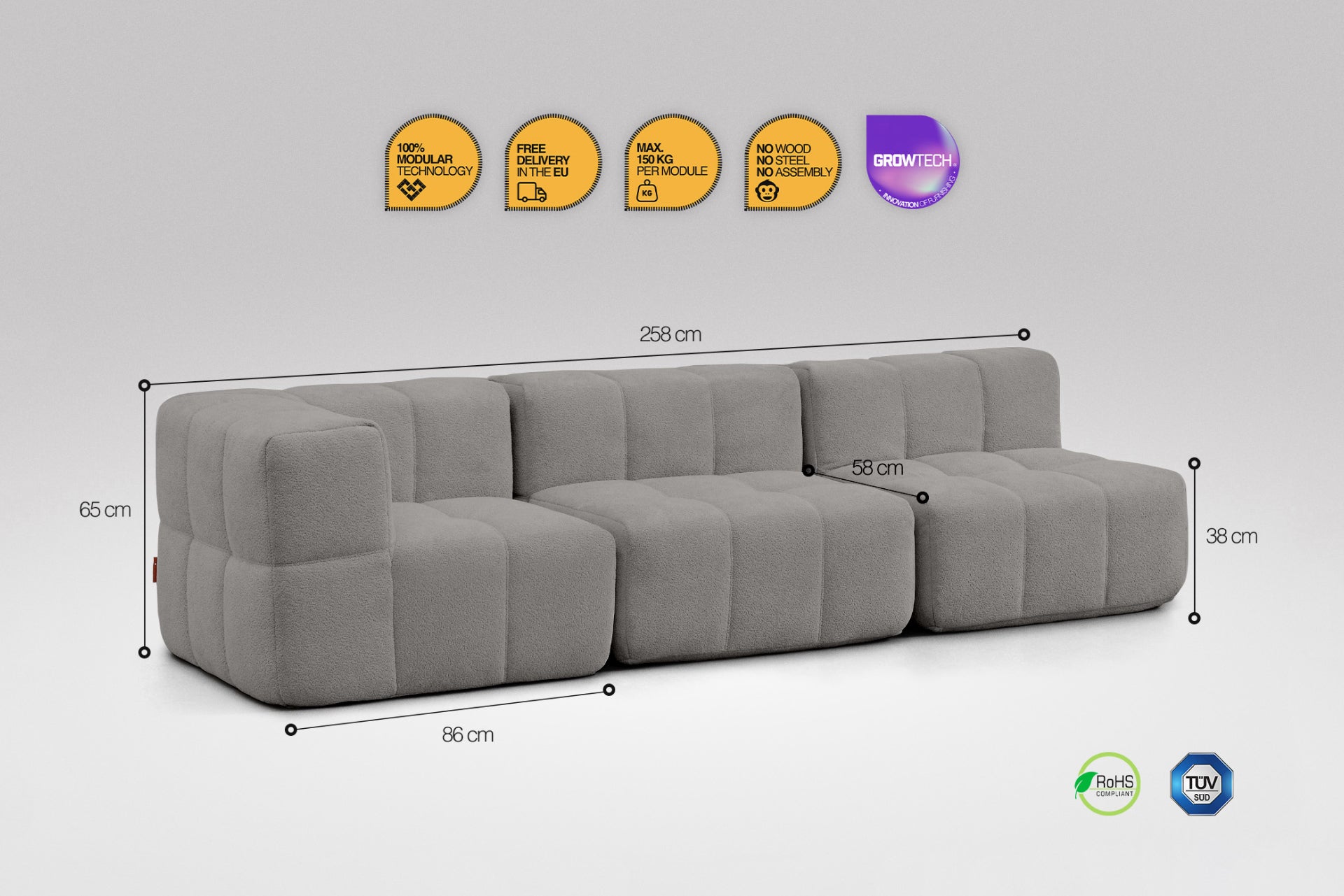 A modulok egyszerűen összekapcsolhatók, így stabilan tartanak egymás mellett – nincs szétcsúszás, csak masszív kényelem. Csúszásgátló felületük és ideális súlyuk gondoskodik róla, hogy a kanapé a helyén maradjon, mégis könnyedén átrendezhesd, ha új hangulatra vágysz.