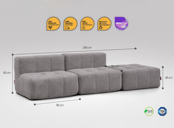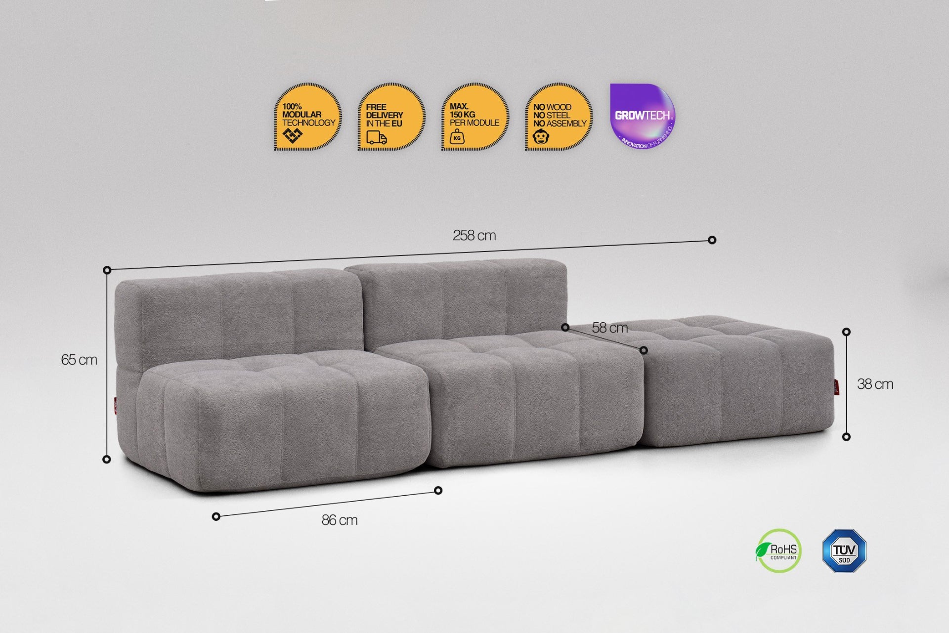 A modulok egyszerűen összekapcsolhatók, így stabilan tartanak egymás mellett – nincs szétcsúszás, csak masszív kényelem. Csúszásgátló felületük és ideális súlyuk gondoskodik róla, hogy a kanapé a helyén maradjon, mégis könnyedén átrendezhesd, ha új hangulatra vágysz.