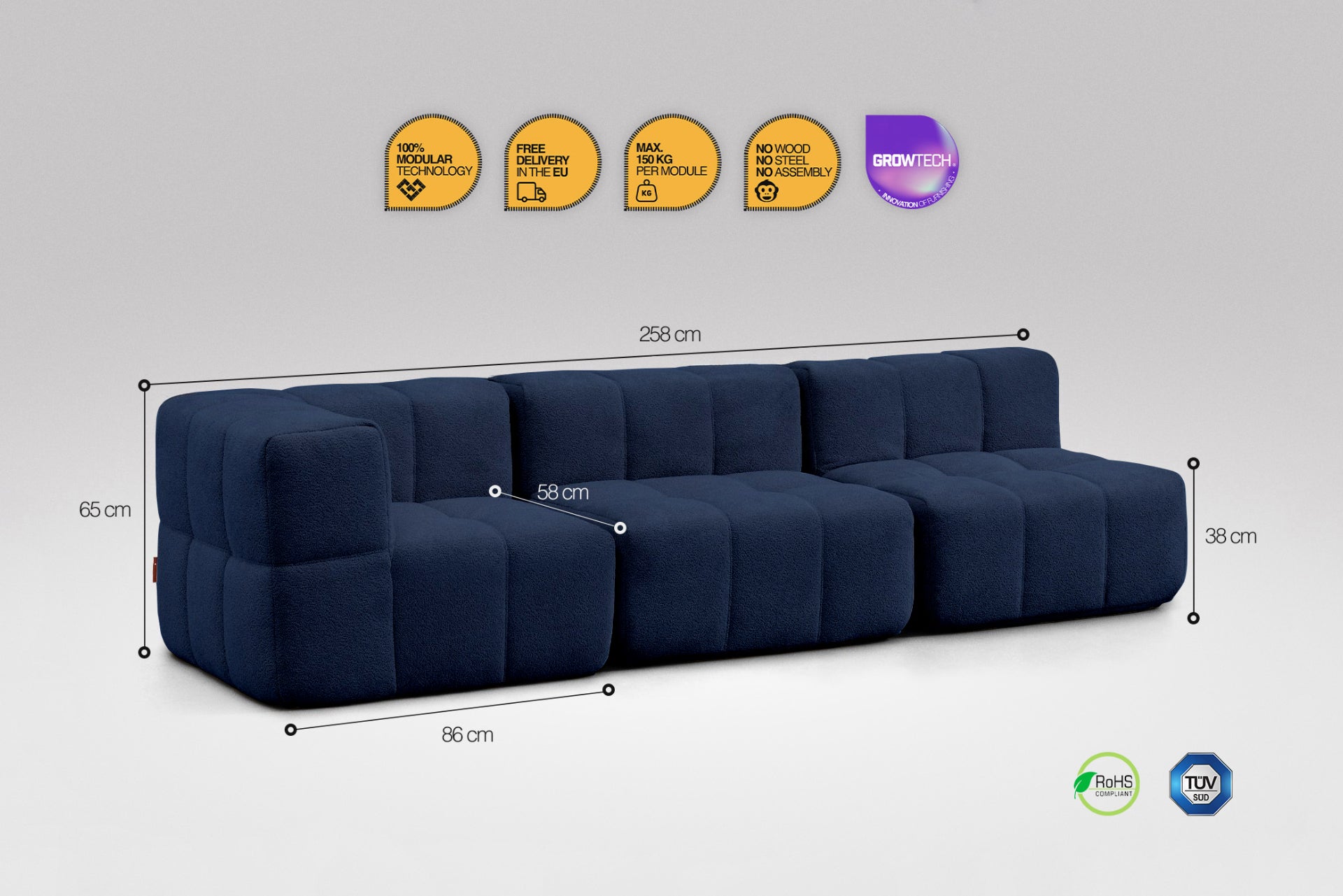 A modulok egyszerűen összekapcsolhatók, így stabilan tartanak egymás mellett – nincs szétcsúszás, csak masszív kényelem. Csúszásgátló felületük és ideális súlyuk gondoskodik róla, hogy a kanapé a helyén maradjon, mégis könnyedén átrendezhesd, ha új hangulatra vágysz.