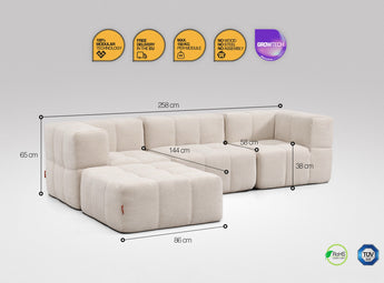 A modulok egyszerűen összekapcsolhatók, így stabilan tartanak egymás mellett – nincs szétcsúszás, csak masszív kényelem. Csúszásgátló felületük és ideális súlyuk gondoskodik róla, hogy a kanapé a helyén maradjon, mégis könnyedén átrendezhesd, ha új hangulatra vágysz.